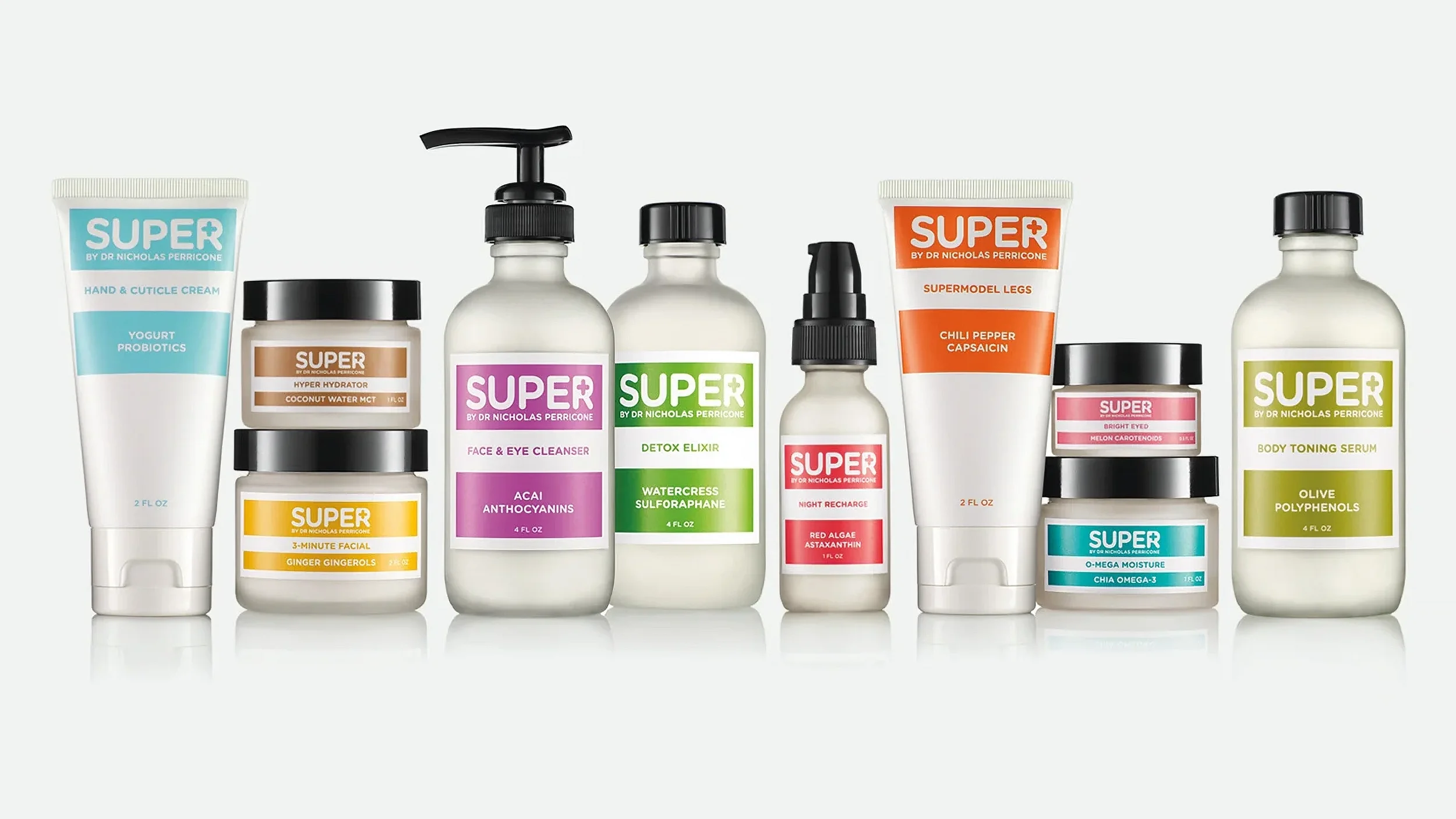 Super by Nicholas Perricone is a skincare line inspired by the science of superfoods and their transformative effects on skin health. Positioned as a youthful, energetic extension of the Perricone MD brand, Super translates Dr. Perricone’s clinical expertise into an accessible collection that celebrates nutrition, vitality, and everyday wellness. Each product is formulated around a hero superfood ingredient—such as acai, melon, or yogurt—bridging the connection between what we eat and how our skin looks and feels. With its bold, modern packaging and vibrant identity, the brand offers a fresh, playful take on high-performance skincare.